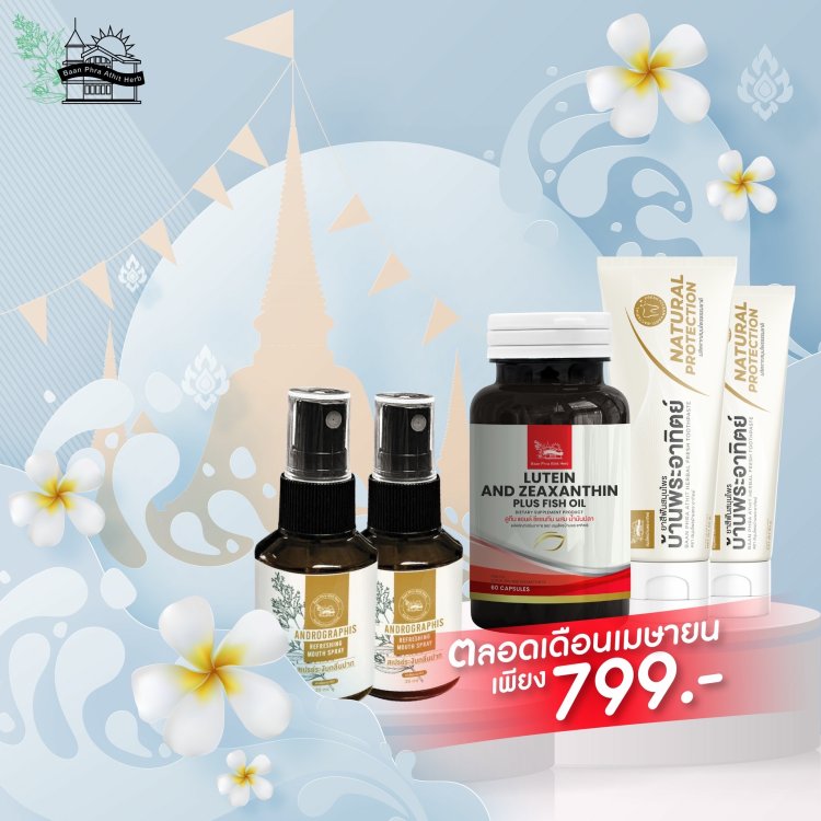 ยาสีฟันสมุนไพรบ้านพระอาทิตย์ 2 หลอด - แอนโดรกราฟิส รีเฟรชชิ่ง เม้าท์ สเปรย์ 2 ขวด - ลูทีน แอนด์ ซีแซนทีน 1 ขวด